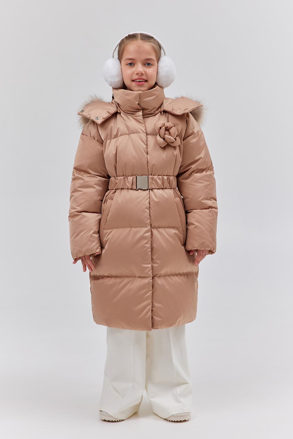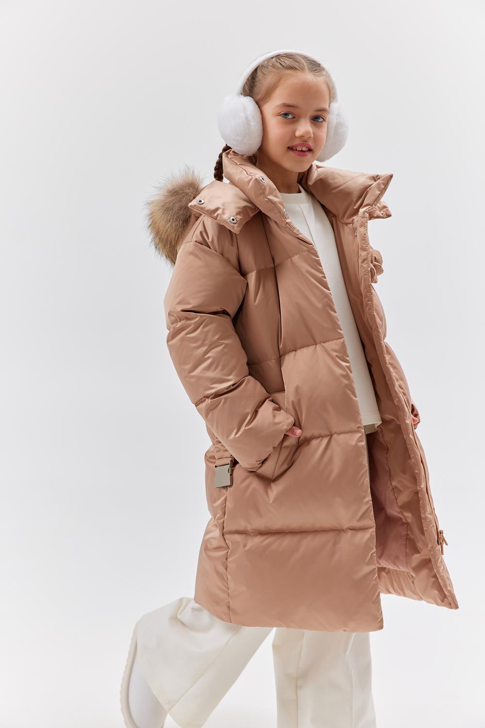 Пальто свободного прямого силуэта. Рукав втачной, со спущенной линией плеча.Воротник-стойка. Капюшон - шлем, застегивающийся на потайные кнопки.Капюшон съемный, пристегивается на молнию.Изделие стеганое широкими горизонтальными переборками. На переде выполнены вертикальные прорезные карманы с листочками. Внутри рукав оформлен трикотажными манжетами. С помощью съемного пояса возможна трансформация силуэта.